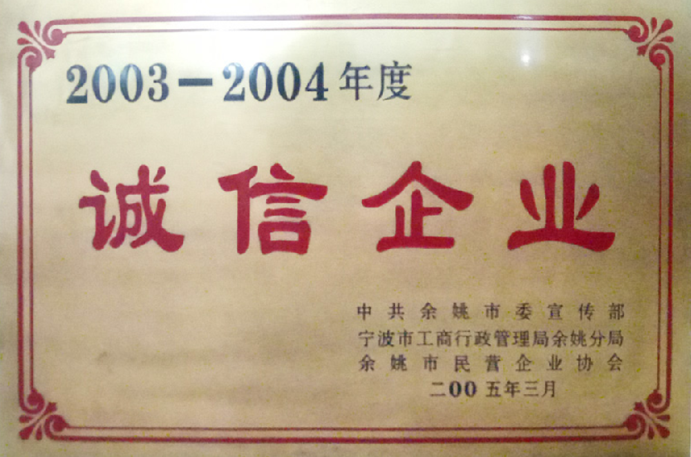 2005年3月,被中共余姚市委宣傳部、寧波市工商行政管理局余姚分局、余姚市民營企業(yè)協(xié)會(huì)聯(lián)合評定為2003-2004年度“誠信企業(yè)”