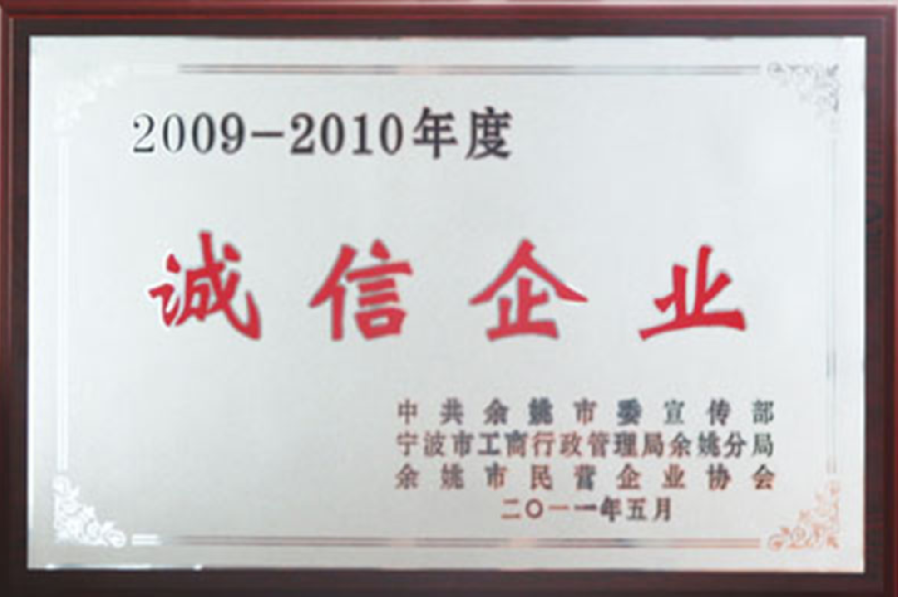 2011年5月,被中共余姚市委宣傳部、寧波市工商行政管理局余姚分局、余姚市民營企業(yè)協(xié)會(huì)聯(lián)合評定為2009-2010年度“誠信企業(yè)”