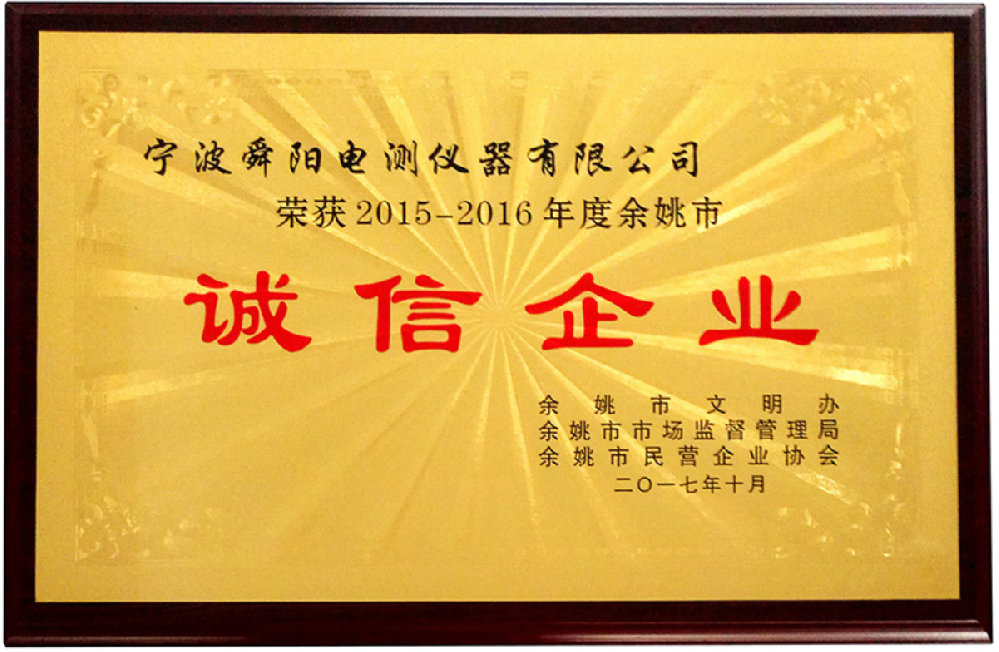 2017年10月,被余姚市文明辦、余姚市市場監(jiān)督管理局、余姚市民營企業(yè)協(xié)會(huì)聯(lián)合評定為2015-2016年度余姚市“誠信企業(yè)”